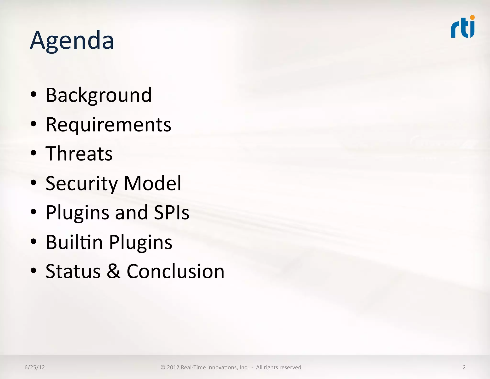The document outlines a security model for Data Distribution Service (DDS) systems, detailing requirements for a platform-independent security framework, including authentication, access control, and data integrity mechanisms. It highlights various threats such as unauthorized access, insider threats, and the importance of maintaining separation between data recipients. Additionally, the submission provides guiding principles, mandatory requirements, and examples of proposed security policies and mechanisms to ensure secure operations within DDS environments.