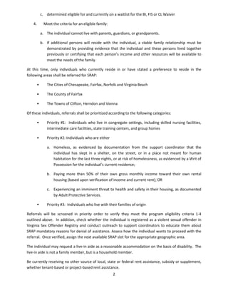 The document provides information about the State Rental Assistance Program (SRAP) administered by the Department of Behavioral Health and Developmental Services. The program provides rental assistance to individuals with developmental disabilities to allow them to rent private market housing of their choosing. To be eligible, individuals must meet certain criteria including having a developmental disability, income requirements, and not receiving other forms of housing assistance. Referrals to the program come from support coordinators and are screened based on priority categories like those currently living in institutional settings. Public housing authorities then determine financial eligibility and screen for criminal history before approving assistance.