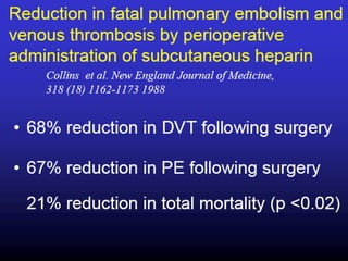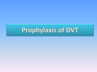This document discusses various cases of hospitalized patients at risk for venous thromboembolism (VTE) and highlights the importance of prophylaxis in preventing deep vein thrombosis (DVT) and pulmonary embolism (PE). It presents clinical factors, prevalence statistics, risk assessments, and treatment algorithms related to VTE management in medical and surgical settings. The document emphasizes the effectiveness of various prophylactic measures and the need for targeted risk assessment to reduce fatal outcomes associated with VTE.