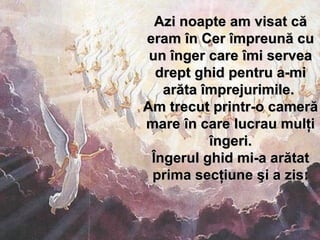 Visul meu a inclus un înger care m-a călăuzit prin cer, unde am văzut cum se primesc și se livrează rugăciunile și binecuvântările oamenilor. Am fost uimit de cât de puțini oameni trimit confirmări de primire pentru binecuvântările primite, deși are mai multe motive să fie recunoscători. Mesajul subliniază importanța recunoștinței și ne încurajează să apreciem binecuvântările din viața noastră.
