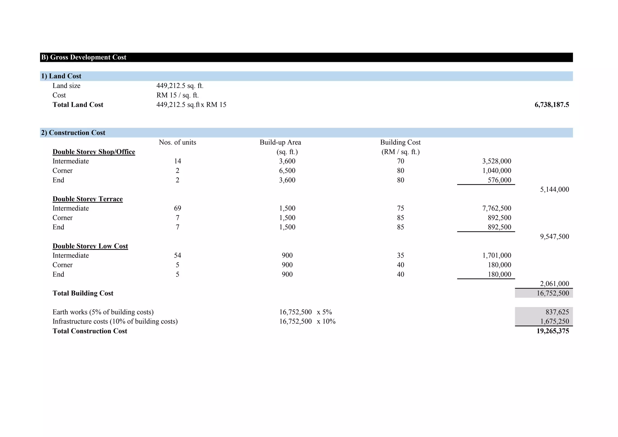 This section provides a financial appraisal of a proposed property development using the residue method of valuation. It details the gross development value, land and construction costs, administrative costs including fees and financing, and contingencies to calculate the total gross development cost. The gross development profit is then determined by taking the difference between the gross development value and cost, which in this case is RM16,305,112.44 or 29.94% of the gross development value.