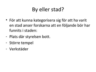 By eller stad?För att kunna kategorisera sig för att ha varit en stad anser forskarna att en följande bör har funnits i staden: Plats där styrelsen bott. Större tempel Verkstäder