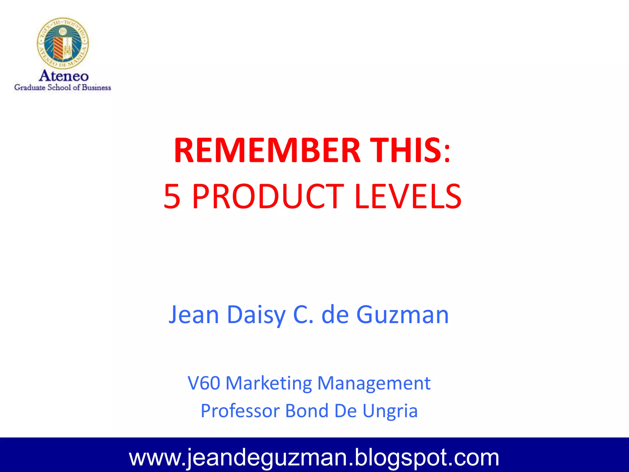 The document discusses the 5 levels of a product's development: core benefit, basic product, expected product, augmented product, and potential product. It provides examples of how these levels relate to the development of desserts like an apple pie or cupcake. The 5 levels ensure that a product meets customer needs and expectations and can be improved over time. Desserts start with a core ingredient and undergo baking, taste testing, toppings additions, and ideas for future adaptations to satisfy customers at each level.