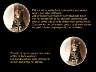 Pak uw katop en leg hem in de ronding van uw arm alsof u een baby vasthoudt. Zet uw rechter wijsvinger en duim aan beide zijden van het snoetje van de kat en oefen voorzichtig wat druk uit terwijl u de pil in de andere hand gereed houdt. Zodra uw kat het bekje opent gooit u de pil naar binnen en geeft u de kat de gelegenheid om te slikken. Zoek de pil op de vloer en haal de kat achter de bank vandaan. Leg de kat opnieuw in de ronding van uw arm en herhaal het proces.