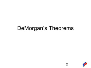 DeMorgan's theorems state that: 1) The negation of a conjunction is the disjunction of the negations. 2) The negation of a disjunction is the conjunction of the negations. They can be used to transform logical expressions between conjunctive and disjunctive normal form by distributing negations inward and changing conjunctions to disjunctions (or vice versa). The document provides examples of applying DeMorgan's theorems to logically equivalent expressions.