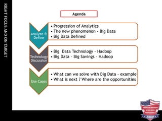 This document discusses big data and provides an overview of the topic. It defines big data as high-volume, high-velocity, and high-variety data that requires new technologies and techniques to capture, store, distribute, manage and analyze. The document outlines the progression of analytics and data challenges posed by big data. It also describes common big data technologies like Hadoop, MapReduce and HBase and provides examples of big data use cases and opportunities.