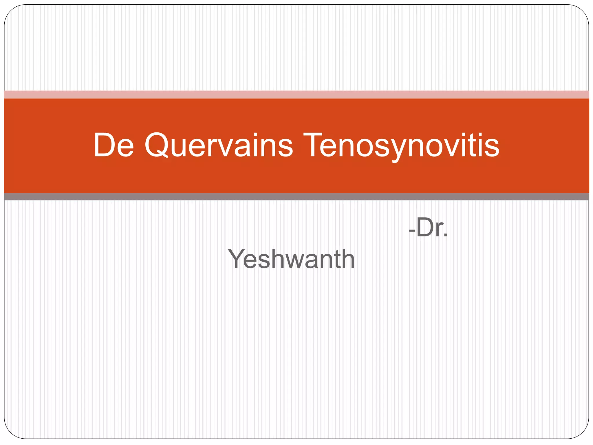 De Quervain's tenosynovitis is a condition affecting the tendons that control thumb movement at the wrist. It causes pain and swelling on the outer side of the wrist. Nonsurgical treatments include splinting, anti-inflammatory medication, and corticosteroid injections into the affected tendon sheath. If conservative treatments fail after 6 months, surgical release of the tendon sheath is recommended to relieve pressure and promote healing. The surgery involves cutting the fibrous roof of the tendon compartment to decompress the tendons.