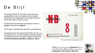 De Stijl, an art and design movement founded by Piet Mondrian and Theo van Doesburg in response to World War I, emphasized total abstraction using basic components like vertical and horizontal lines and primary colors. The movement influenced architecture, typography, and everyday objects, creating a structured and disciplined aesthetic that moved beyond decorative trends of the past. Its principles continue to resonate in modern design, as seen in contemporary technology and typography.