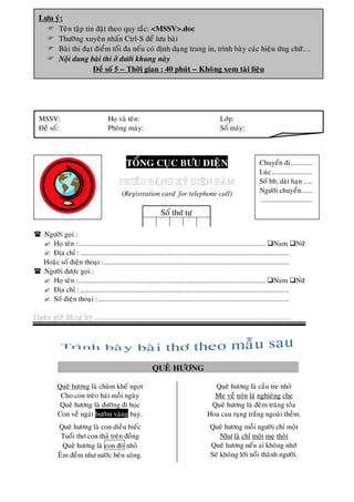 Teân taäp tin ñaët theo quy taéc: <MSSV>.doc Thöôøng xuyeân nhaán Ctrl-S ñeå löu baøi Baøi thi ñaït ñieåm toái ña neáu coù ñònh daïng trang in, trình baøy caùc hieäu öùng chöõ… Noäi dung baøi thi ôû döôùi khung naøy Ñeà soá 5 – Thôøi gian : 40 phuùt – Khoâng xem taøi lieäu MSSV: Hoï vaø teân: Lôùp: Ñeà soá: Phoøng maùy: Soá maùy: TOÅNG CUÏC BÖU ÑIEÄN Chuyeån ñi ............ Luùc ....................... Soá bb, daøi haïn ..... (Registration card for telephone call) Ngöôøi chuyeån ...... ............................. Soá thöù töï Ngöôøi goïi : Hoï teân :......................................................................................................... Nam Nöõ Ñòa chæ : ..................................................................................................................... Hoaëc soá ñieän thoaïi :........................................................................................................ Ngöôøi ñöôïc goïi : Hoï teân :......................................................................................................... Nam Nöõ Ñòa chæ : ..................................................................................................................... Soá ñieän thoaïi : ........................................................................................................... QUEÂ HÖÔNG Queâ höông laø chuøm kheá ngoït Queâ höông laø caàu tre nhoû Cho con treøo haùi moãi ngaøy Meï veà noùn laù nghieâng che Queâ höông laø ñöôøng ñi hoïc Queâ höông laø ñeâm traêng toûa Con veà ngaùt böôùm vaøng bay. Hoa cau ruïng traéng ngoaøi theàm. Queâ höông laø con dieàu bieác Queâ höông moãi ngöôøi chæ moät Tuoåi thô con thaû treân ñoàng Nhö laø chæ moät meï thoâi Queâ höông laø con ñoø nhoû Queâ höông neáu ai khoâng nhôù EÂm ñeàm nhö nöôùc beân soâng. Seõ khoâng lôùi noåi thaønh ngöôøi.