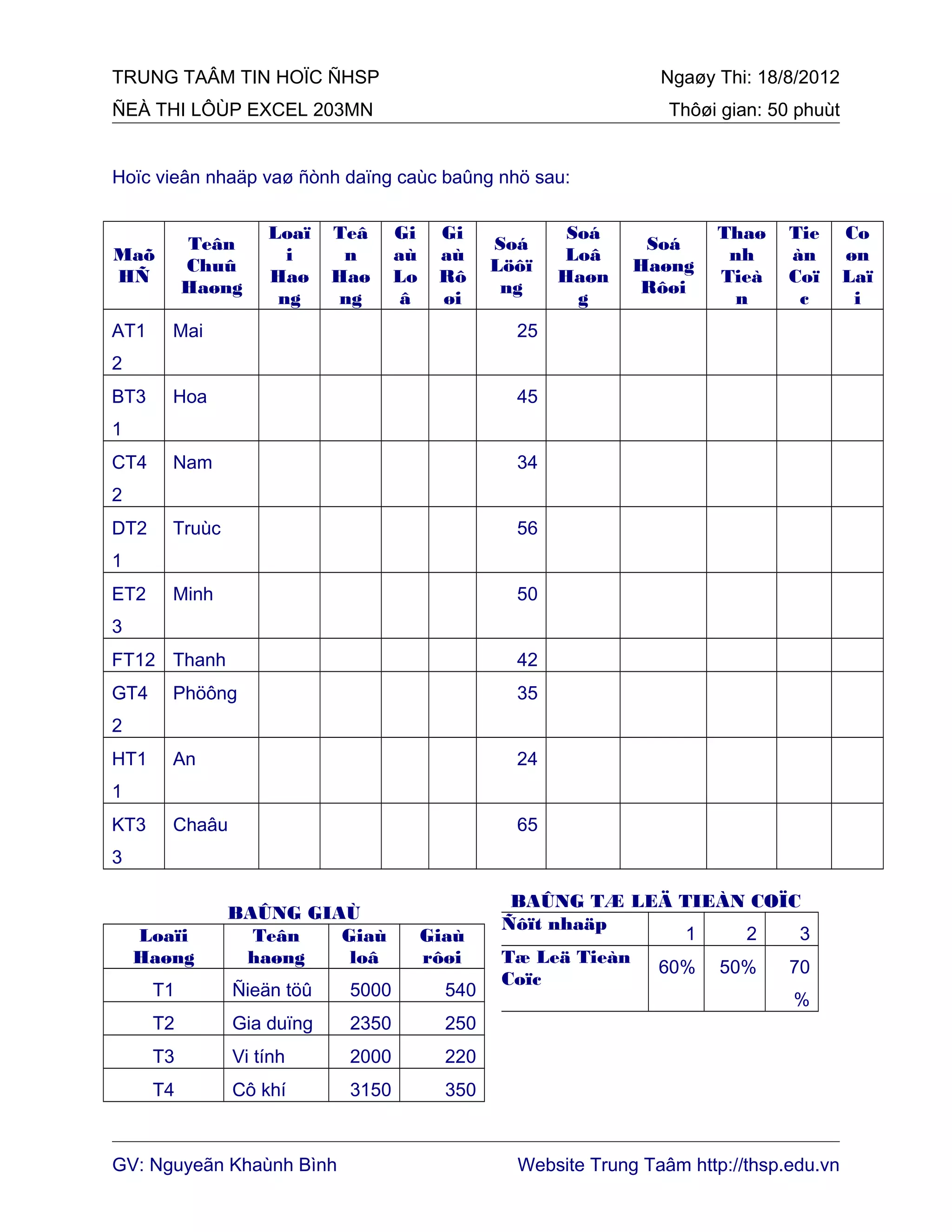 Tài liệu mô tả đề thi lốp Excel với 10 câu hỏi liên quan đến việc nhập và định dạng bảng dữ liệu. Các câu hỏi yêu cầu học viên thực hiện các phép toán và phân tích dữ liệu từ bảng theo các yêu cầu cụ thể. Đề thi diễn ra trong 50 phút vào ngày 18/8/2012, giáo viên phụ trách là Nguyễn Khánh Bình.