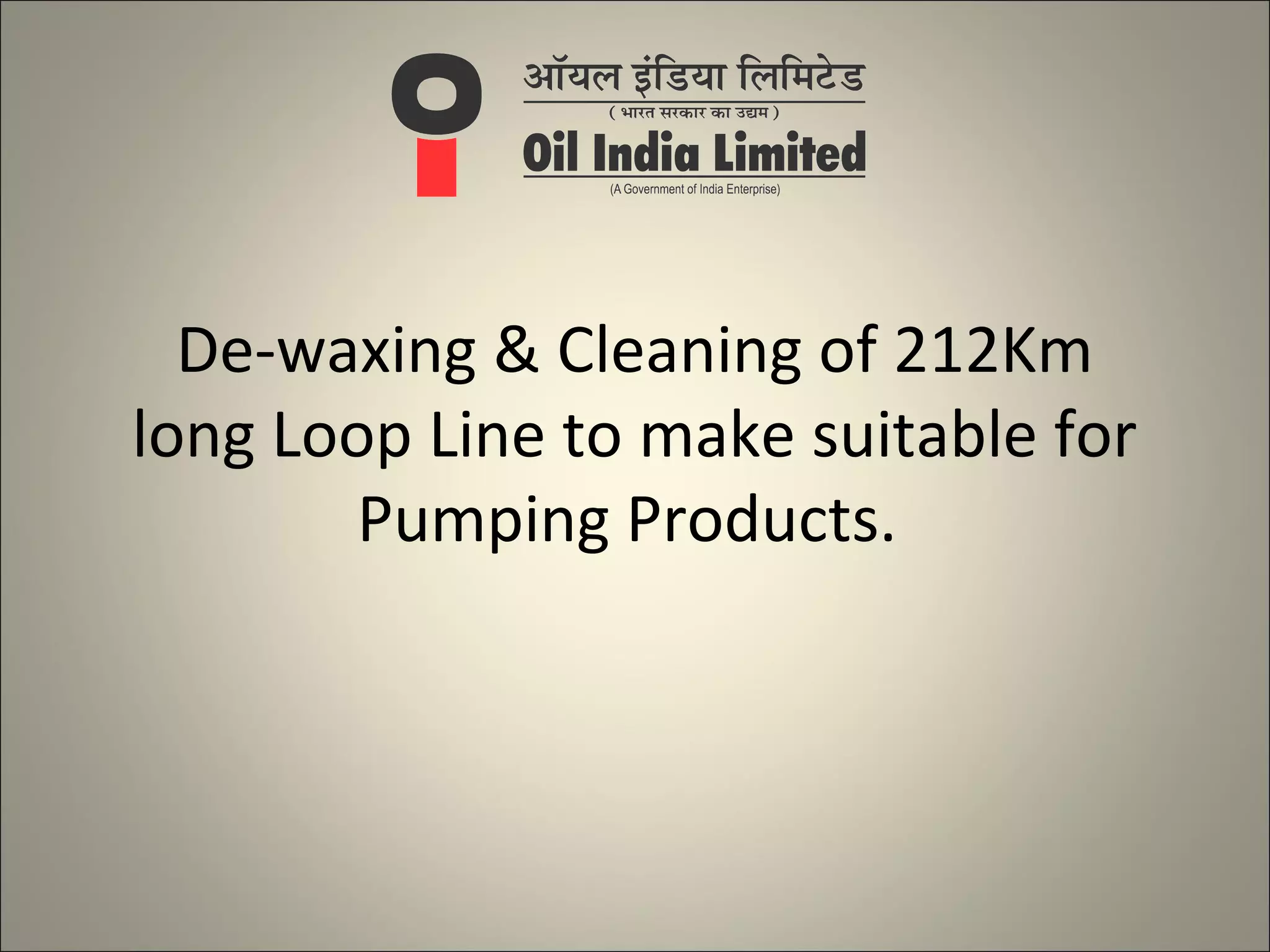 The document describes the de-waxing and cleaning process of a 212km long 16" loop line to prepare it for pumping products. A piece of land was rented and equipment like compressors, pumps, and boilers were used. The process involved pigging the line with different pigs using crude oil, then sweeping crude oil out with compressed air and water, followed by hot water pigging and chemical cleaning. Over 66 pigging operations were conducted removing over 20,000kg of wax from the Kaziranga to Sekoni sector. A similar process was then conducted from Sekoni to Ghani removing less wax.