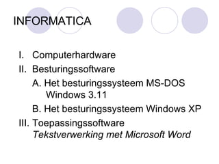 INFORMATICA I. ComputerhardwareII. Besturingssoftware A. Het besturingssysteem MS-DOS Windows 3.11 B. Het besturingssysteem Windows XP III. Toepassingssoftware Tekstverwerking met Microsoft Word