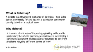 This document provides instructions for a group debate activity on reducing school dropout. It outlines the debate topics for different groups on relationships between students and teachers or classmates and positive school experiences. It provides expressions for debating and establishes roles for group members. Students are instructed to ask and answer questions, make proposals to reduce dropout, and present their work in a digital poster. The goal is to have students improve speaking skills through structured discussion of issues related to school engagement and completion.