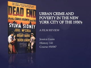 The document provides a summary of the 1937 film "Dead End" about urban crime and poverty in 1930s New York City. It introduces the main characters: the Dead End Kids gang led by Tommy Gordon; Baby Face Martin who returns to his old neighborhood and plots a kidnapping; Drina Gordon who tries to prevent her brother Tommy from a life of crime; and Dave Connell, an unemployed architect who gets involved with the gang. The summary outlines some of the key events in the film, including Tommy stabbing a rich man's son, Dave killing Baby Face Martin, and Dave starting a relationship with Drina at the end.