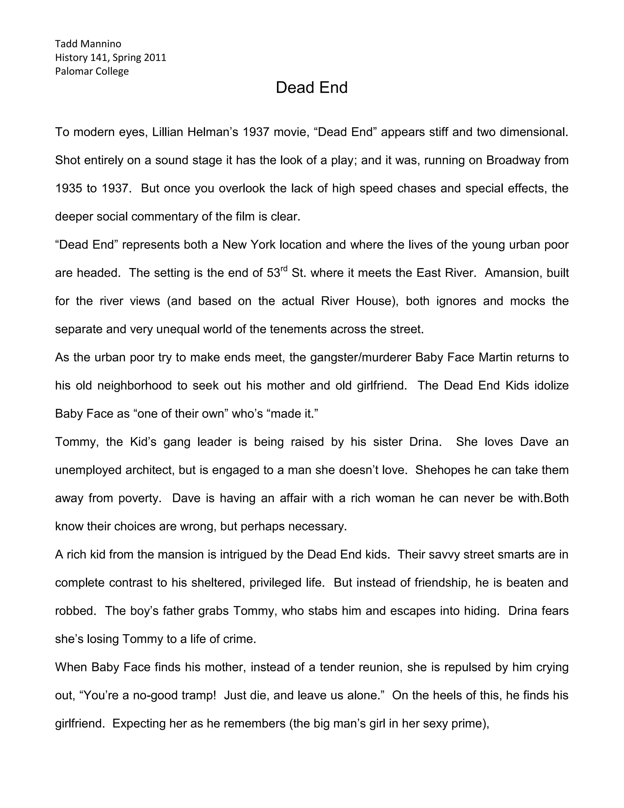 The document provides a summary of the 1937 film "Dead End" by Lillian Hellman. It was shot on a sound stage like a play and depicts the social divide between the urban poor living in tenement buildings and the wealthy living in mansions overlooking the East River in New York City. The film follows the Dead End Kids gang and their interactions with a returning criminal and a rich boy from the mansion. It highlights the difficult choices and limited opportunities facing the impoverished characters.