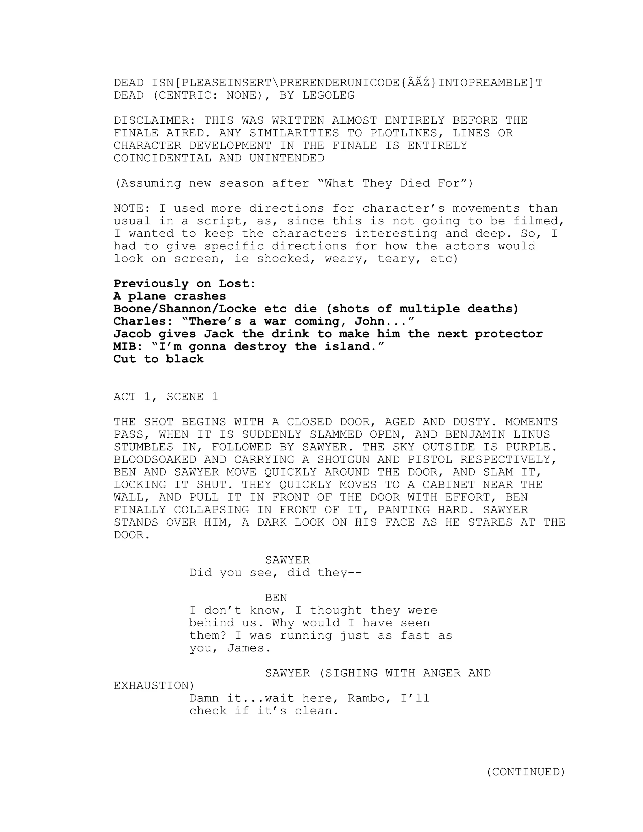 The document is a script for a potential new season of the TV show Lost. It begins with Ben and Sawyer barricading themselves in a house from an unknown pursuer. They find Eko dead inside. Later, Richard appears injured and claims the Man in Black attacked him. Sawyer punches Richard, blaming him for prior deaths. Ben then appears, saying the Man in Black has already won and will have Ben kill Kate to prove it. The script sets up further conflict between the survivors and the Man in Black.