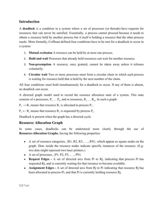 Deadlocks occur when processes are waiting for resources held by other processes, resulting in a circular wait. Four conditions must be met: mutual exclusion, hold and wait, no preemption, and circular wait. Deadlocks can be handled through avoidance, prevention, or detection and recovery. Avoidance algorithms allocate resources only if it ensures the system remains in a safe state where deadlocks cannot occur. Prevention methods make deadlocks impossible by ensuring at least one condition is never satisfied, such as through collective or ordered resource requests. Detection finds existing deadlocks by analyzing resource allocation graphs or wait-for graphs to detect cycles.