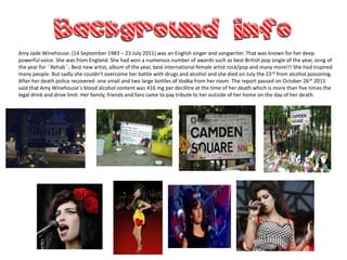 Amy Winehouse was an English singer known for her powerful voice who won numerous awards, but struggled with substance abuse issues. She was found dead at age 27 from alcohol poisoning, with high levels of alcohol in her system. Her struggles led to health issues like weight loss and dental problems over her career. She had been in and out of rehabilitation facilities and had several run-ins with the law related to substances. If not for her early death, she may have created more music and accomplished other goals and dreams in her life and career.