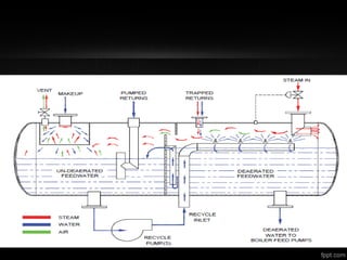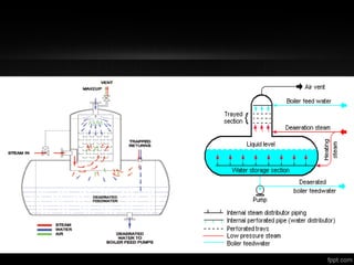 The document discusses the instrumentation and control of deaerators, which are used to remove dissolved gases, particularly oxygen and carbon dioxide, from water. It describes different techniques for gas removal, including reducing pressure and increasing temperature, as well as types of deaerators such as tray and spray types. Additionally, it outlines three control systems for deaerators: level control, modified level control, and pressure control.