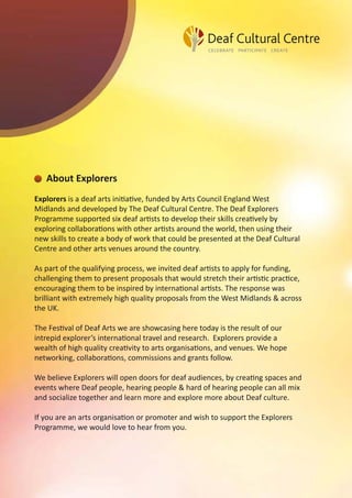 The document announces an Explorers Festival of Deaf Arts taking place in October 2013 at the Deaf Cultural Centre in Birmingham. It features three events - Sunrise: Meet the Deaf Explorers on October 11th, an exhibition of Rubbena Aurangzeb-Tariq's artwork from October 11th-November 14th, and Sunset: Showtime! on October 18th. The festival will showcase performances, stories, and artwork from six deaf artists - Rinkoo Barpaga, Ruth Montgomery, Rubbena Aurangzeb-Tariq, Billy Read, Semhar Beyene, and Donna Williams - who developed their skills through an Explorers arts initiative program.