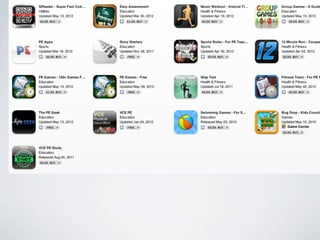 The document discusses using technology tools and apps to enhance physical education programs for 21st century students. It lists over 30 apps that can be used for various purposes like tracking fitness, assessing skills, managing class data, and more. The document encourages incorporating these information and communication technologies into PE pedagogies and provides examples of classroom activities where students can teach skills on video or take on roles for a sports simulation activity.