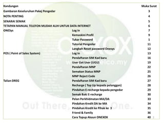Dokumen ini memberikan panduan lengkap mengenai perkhidmatan pengedar Onexox termasuk pendaftaran kad SIM baru dan MNP (Mobile Number Portability). Terdapat langkah-langkah dan syarat-syarat penting yang harus dipatuhi oleh pengedar dan pelanggan sebelum melakukan pendaftaran. Selain itu, dokumen ini juga memperincikan prosedur untuk mengemas kini maklumat dan pelbagai fungsi yang disediakan bagi pengedar dan pelanggan.