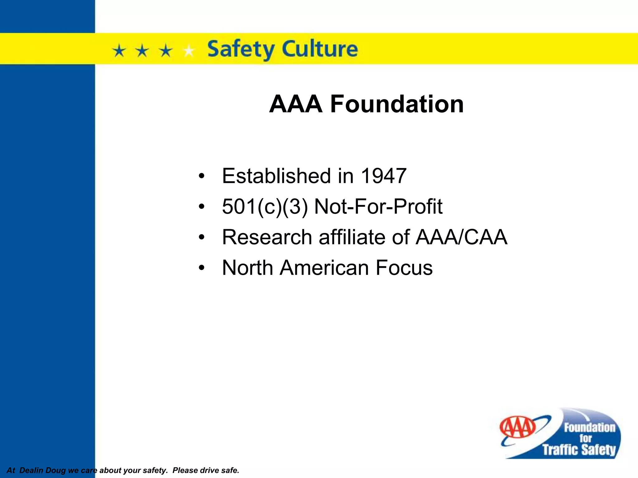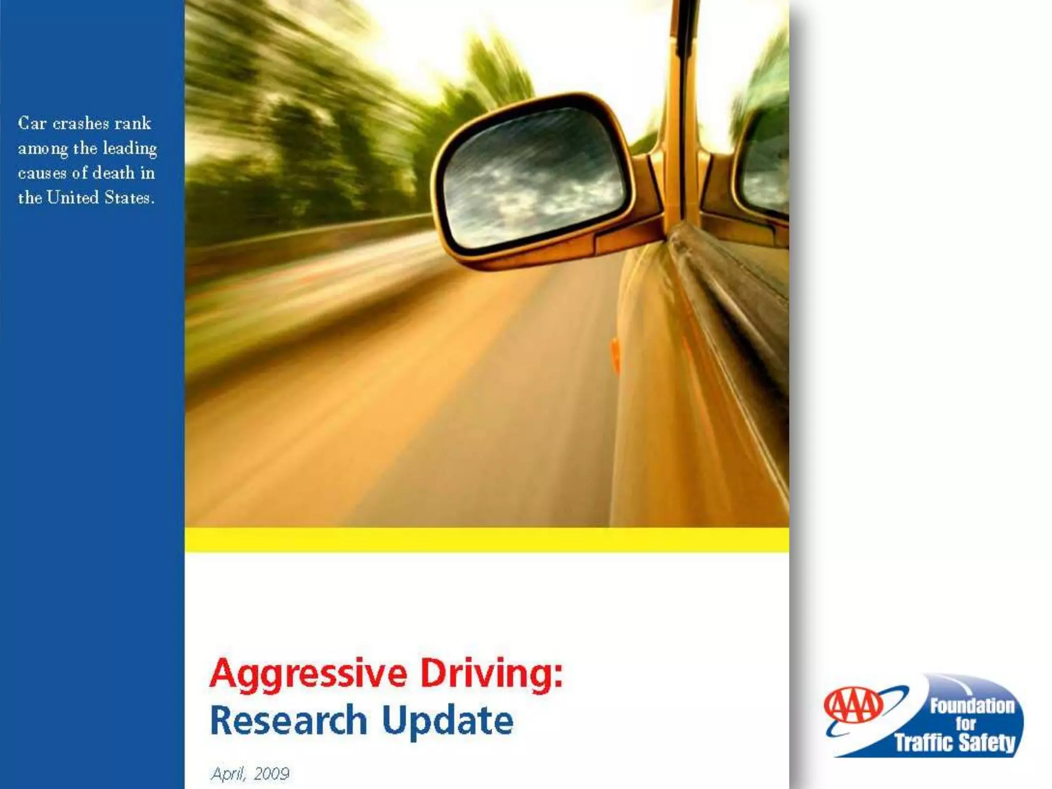 The AAA Foundation was established in 1947 as a 501(c)(3) nonprofit research affiliate of AAA/CAA with a focus on traffic safety issues in North America. Its mission is to identify traffic safety problems through research, foster solutions, and disseminate information and education. Surveys have found that aggressive driving is a serious concern, with 32% of respondents in 2005 viewing it as the same threat as drunk driving. However, nearly half of drivers admitted to speeding over 15 mph in the past 30 days. The AAA Foundation's analysis of NHTSA fatal crash data from 2003-2007 found that as many as 56% of fatal crashes involved unsafe driving behaviors associated with aggressive driving such as speeding, illegal lane changes