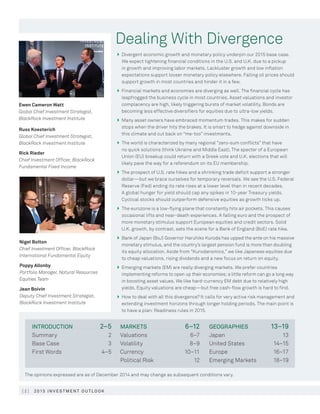 The BlackRock Investment Institute's 2015 Investment Outlook discusses the divergence in global economic growth and monetary policies, predicting U.S. and U.K. financial conditions to tighten due to improved growth, while other regions maintain looser policies. The report highlights high asset valuations and potential market volatility, emphasizing the need for active risk management and proper hedging strategies as many investments are influenced by regional conflicts and economic reforms. Additionally, it points to the implications of low interest rates and the challenges of maintaining traditional diversification as market conditions evolve.