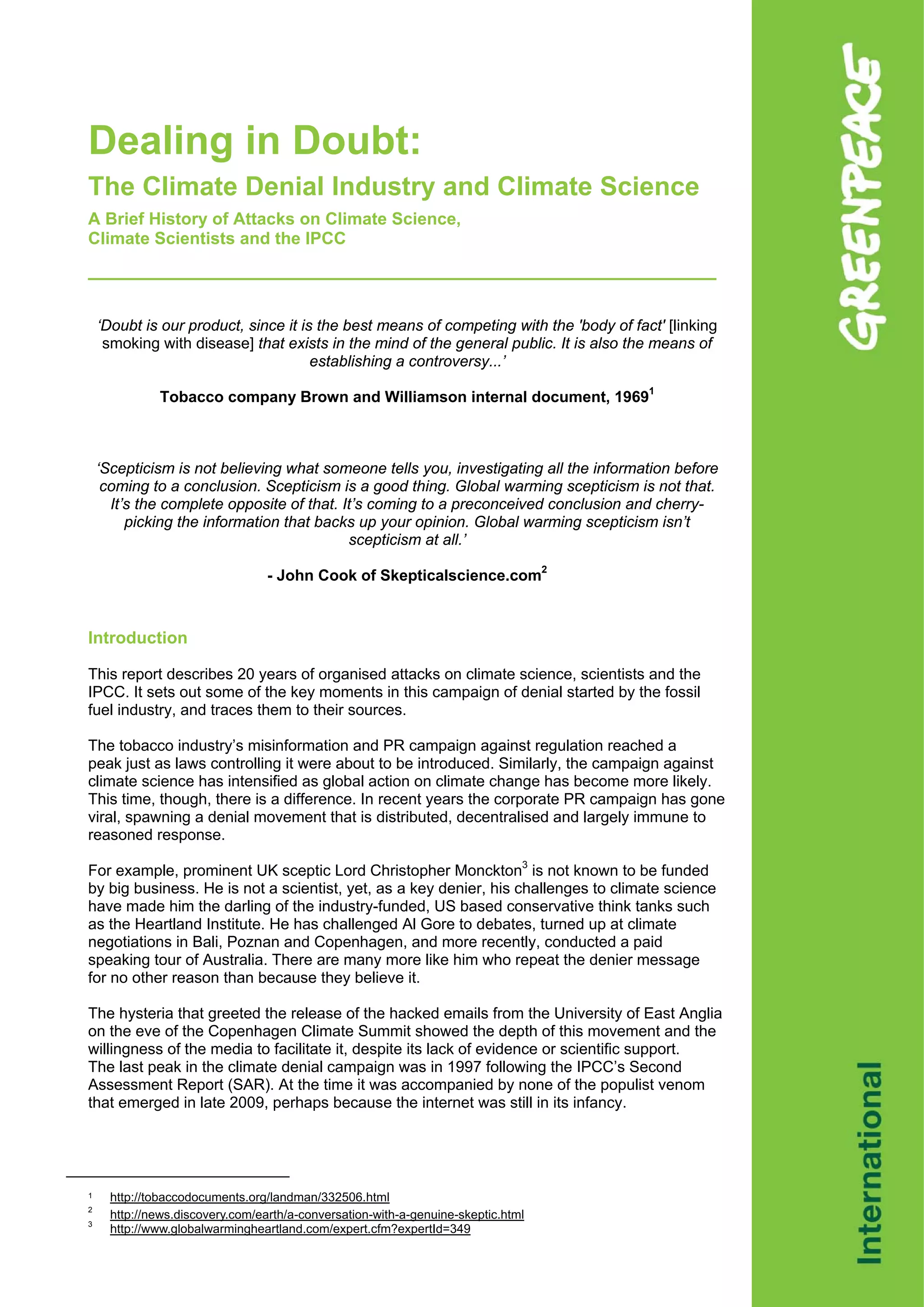 This document provides a brief history of attacks on climate science, climate scientists, and the IPCC over the past 20 years by climate denial groups and individuals. It describes how in the early 1990s, fossil fuel industry groups like the Global Climate Coalition recruited spokespeople to publicly question the science and certainty of climate change. It traces key moments like attacks on the IPCC's first assessment report in 1990 and outlines how the denial campaign intensified with subsequent assessment reports in 1995, 2001, and 2007. The document also examines the tactics used in the campaign, including promoting misleading science, attacking individual scientists, and gaining political influence. It concludes that after 20 years, climate denial has taken deep root in some English-speaking countries.