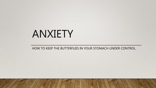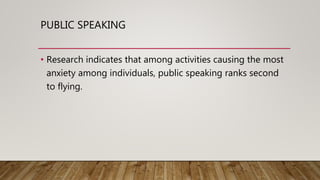 The document discusses techniques for managing anxiety related to public speaking. It explains that anxiety is a natural physiological response but can be facilitated or debilitating. Key recommendations include practicing deep breathing, visualization, adopting a speaking persona, and reciting phrases to warm up vocal muscles before speaking. The goal is to recognize anxiety as natural and put the adrenaline it creates to positive use in the performance.