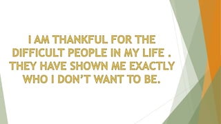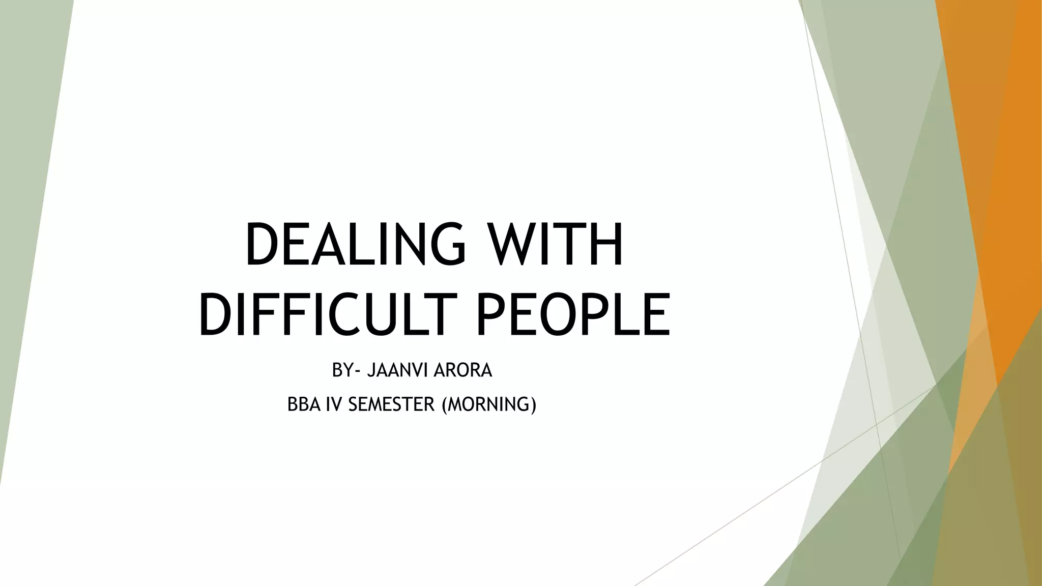 The document discusses the importance of dealing with difficult people, particularly in organizational settings, where such individuals can pose significant challenges for leaders. It categorizes various types of difficult people—such as aggressive, know-it-alls, and chronic complainers—along with strategies for effectively managing interactions with them. The conclusion emphasizes that mastering these skills leads to improved communication, confidence, and leadership success.