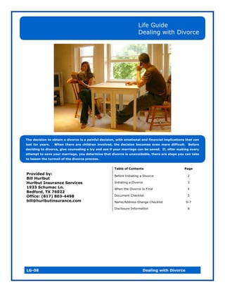 The document provides information to help guide those dealing with divorce. It discusses taking steps before initiating divorce like counseling and financial preparation. It outlines the divorce initiation process including legal matters and agreements. Finally, it notes important post-divorce tasks like changing names and accounts, reviewing insurance, and maintaining child support records. Checklists are included for documents and notifying entities of name and address changes.