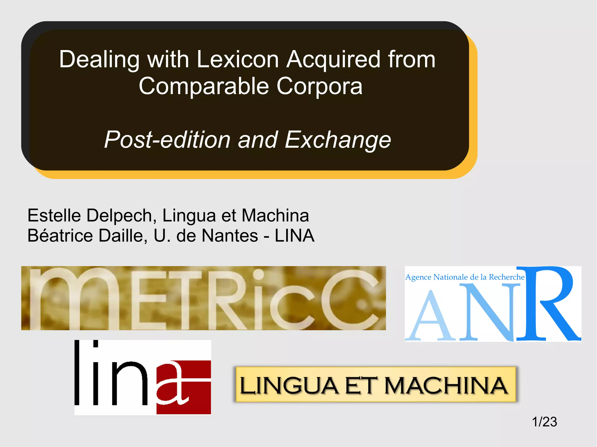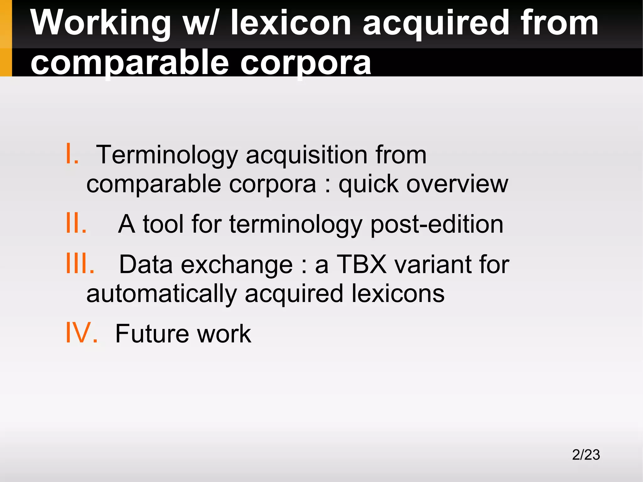 The document discusses the acquisition and post-editing of terminology using comparable corpora, highlighting the advantages of this method in comparison to parallel corpora. It presents a tool designed for processing terminology and outlines data exchange standards using a TBX variant for lexicons. Future work includes integrating prototypes and exploring new strategies for aligning terms and selecting contexts.