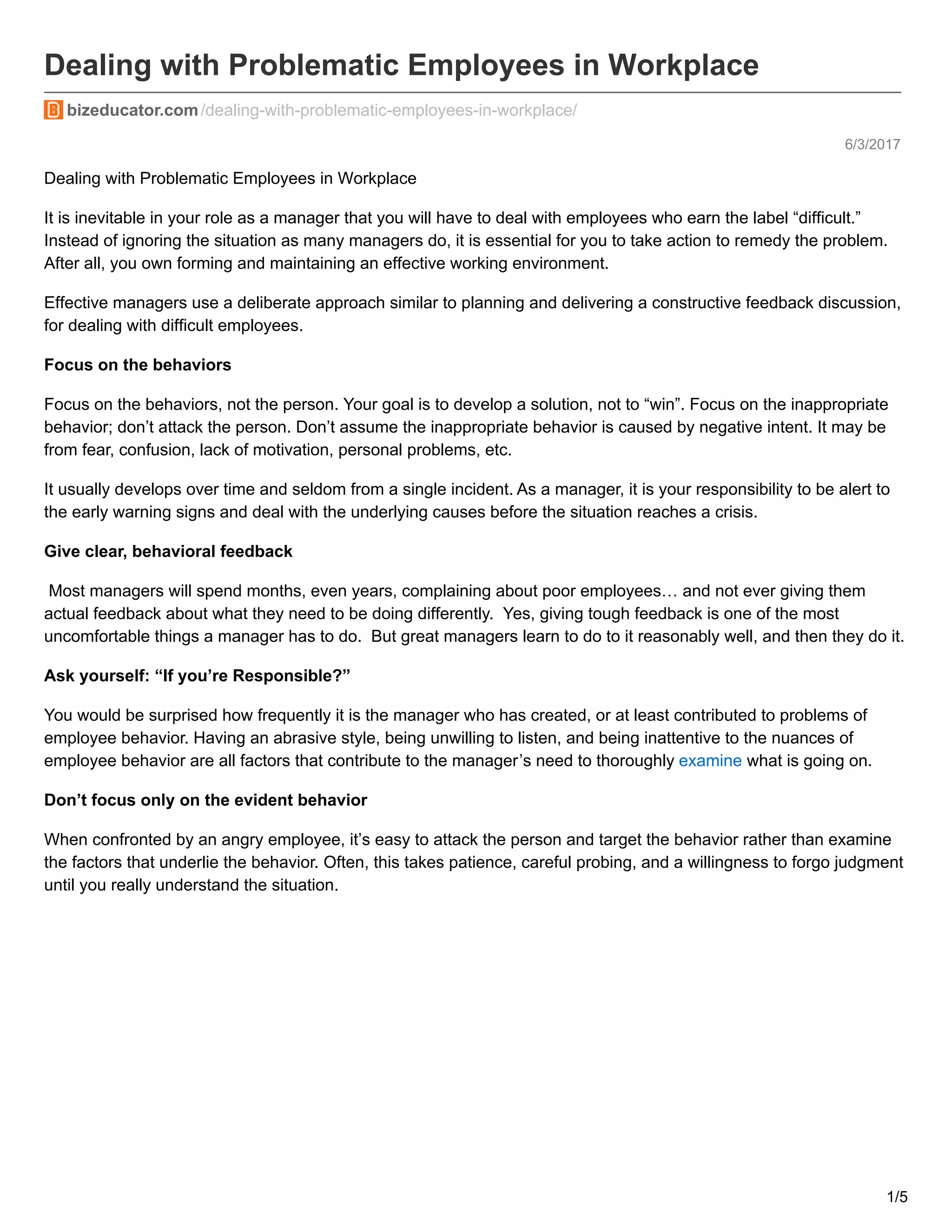 The document outlines strategies for managers to effectively address problematic employees in the workplace by focusing on behaviors rather than personal attacks, providing clear feedback, and understanding underlying issues. It emphasizes the importance of managers examining their own contributions to employee behavior and taking decisive actions when necessary, including the challenging task of terminating an employee. Additionally, it discusses managing change by accepting it as a constant, committing to lifelong learning, and maintaining physical and emotional health.