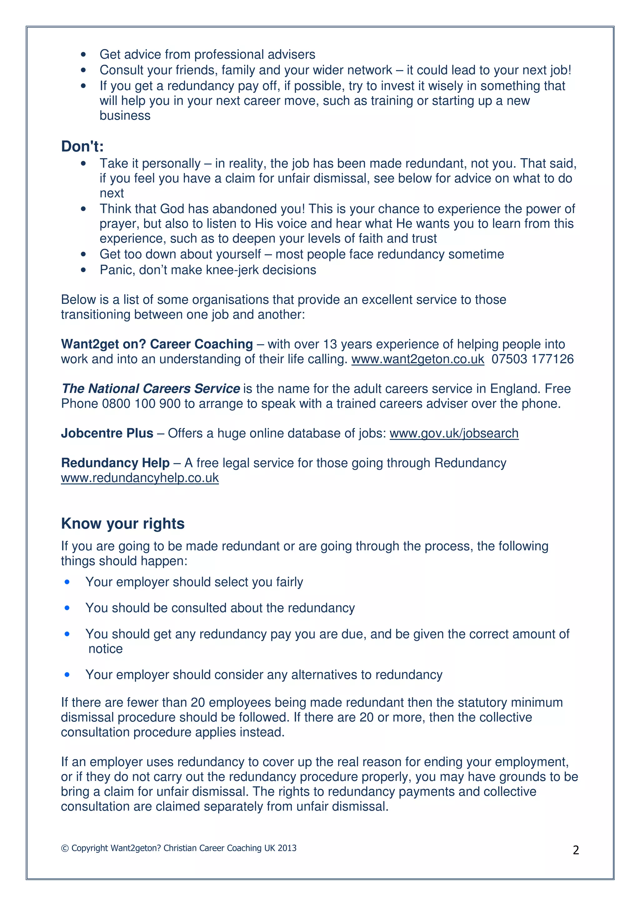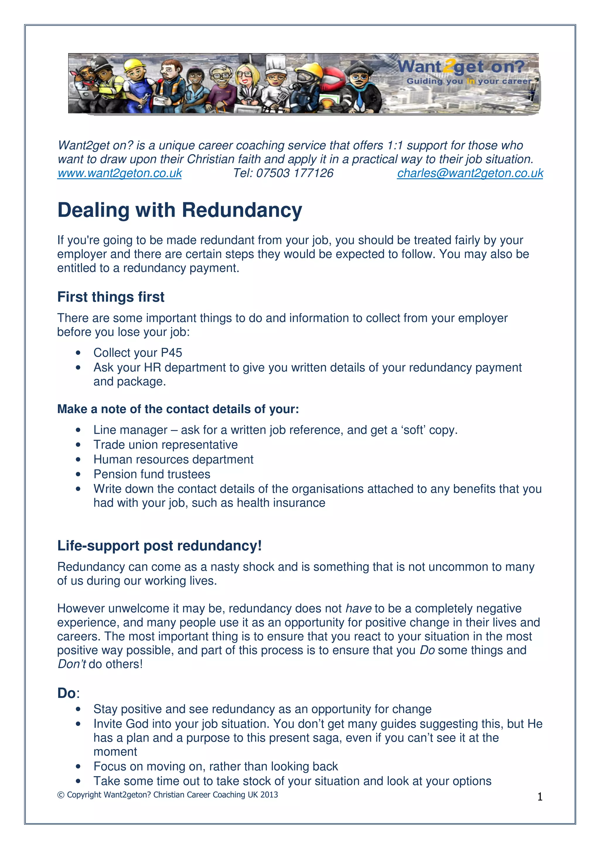 The document outlines the career coaching service 'want2geton?' which aids individuals in leveraging their Christian faith during job transitions, particularly in dealing with redundancy. It details essential steps to take when facing redundancy, such as gathering information from employers, understanding rights, and advice on maintaining a positive outlook. Additionally, it provides resources for legal advice, potential payments due, and support services available to those affected by redundancy.