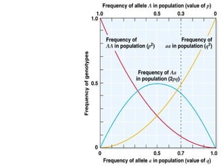 Population genetics studies how allele and gene frequencies change over time in a population. It examines genotypic and allelic frequencies to determine how common certain combinations and individual alleles are. The Hardy-Weinberg principle states that allele and genotype frequencies will remain in equilibrium in a large, randomly mating population with no evolutionary influences. Factors like mutation, genetic drift, migration and selection can cause frequencies to change from this equilibrium over time. Population variation is quantified by measuring heterozygosity and the proportion of polymorphic loci between individuals.