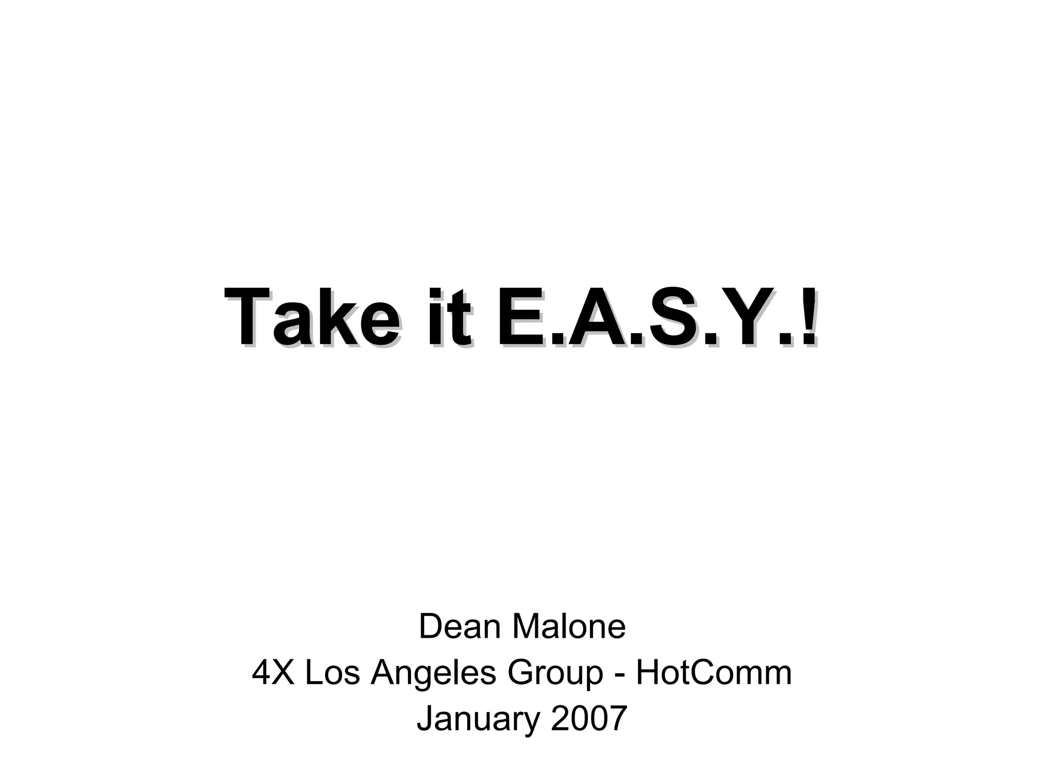 The E.A.S.Y. trading method utilizes average price bars, a price action channel, and the traders dynamic index to identify high probability trade entries and exits in the foreign exchange market. The method analyzes price action, momentum, and market strength across multiple timeframes to find trades that have a high chance of success. Potential entries require positive or negative average price bars to close outside the price action channel boundary along with signals from the traders dynamic index. Strict exit rules based on the indicators are designed to maximize profits and minimize losses on each trade.