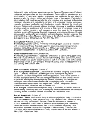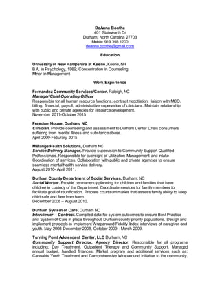 DeAnna Boothe has over 25 years of experience in mental health and human services management. She has a BA in Psychology and has held various roles including clinician, case manager, program director, and chief operating officer at organizations in North Carolina. Her experience includes providing counseling, managing budgets and programs, developing policies and procedures, and collaborating with community partners. She has extensive training and certifications in areas such as motivational interviewing, trauma-informed care, and evidence-based practices.