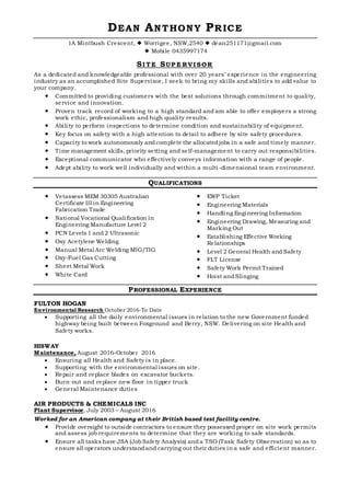Dean Price has over 20 years of experience as a site supervisor and engineer, with expertise in welding, fabrication, maintenance, and ensuring safety compliance. He is seeking a new role where he can apply his skills and commitment to quality, service, and safety. His career includes roles as a plant supervisor for an industrial gas company and site supervisor for environmental projects, where he oversaw contractors and conducted audits.