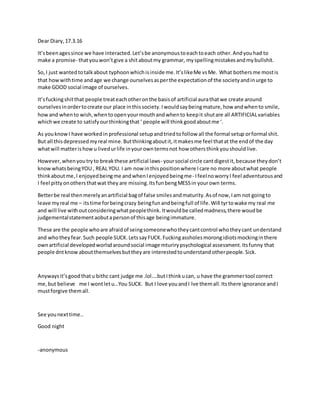 The document is a diary entry discussing the author's desire to live freely without worrying about others' judgments and social expectations. The author feels constrained by artificial social norms and the need to maintain a good public image. However, the author now wants to stop conforming and instead live fully as their "real" self, enjoying life on their own terms rather than trying to please others or meet societal standards of maturity. While some may disapprove or try to control the author, they have decided to no longer care what people think and to embrace being "messy" and having fun according to their own definition of self.
