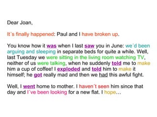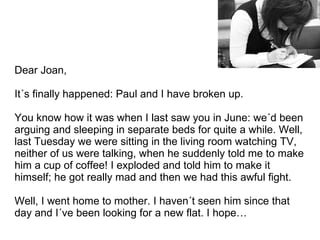 The writer tells her friend Joan that she has broken up with her boyfriend Paul after a major argument. They had been sleeping in separate beds and arguing frequently for some time. During a tense moment watching TV together in silence, Paul abruptly asked her to make him a cup of coffee, but she exploded at him to make it himself. They had a big fight and she moved in with her mother, and has not seen Paul since. She has also started looking for a new place to live.
