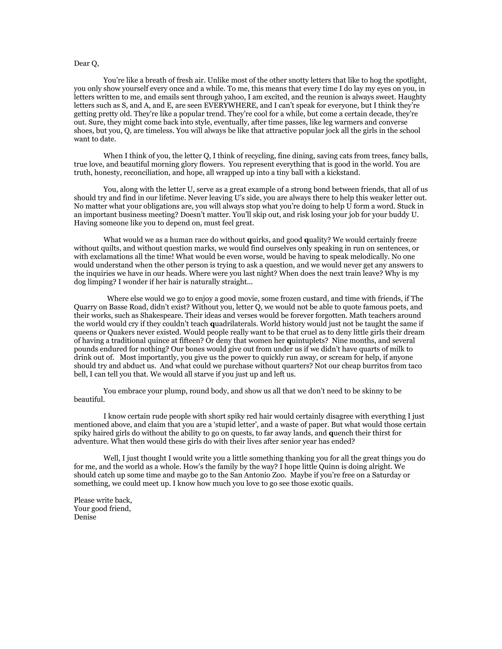 The letter writer expresses their appreciation for the letter Q. They see Q as unique and exciting to encounter due to its less frequent use compared to letters like S, A, and E. Q represents positive attributes like hope, honesty, and friendship. The writer lists many words and concepts that would not exist without Q, affecting language, history, education, and everyday life. They invite Q to reconnect and visit the zoo, showing their value for their friendship.