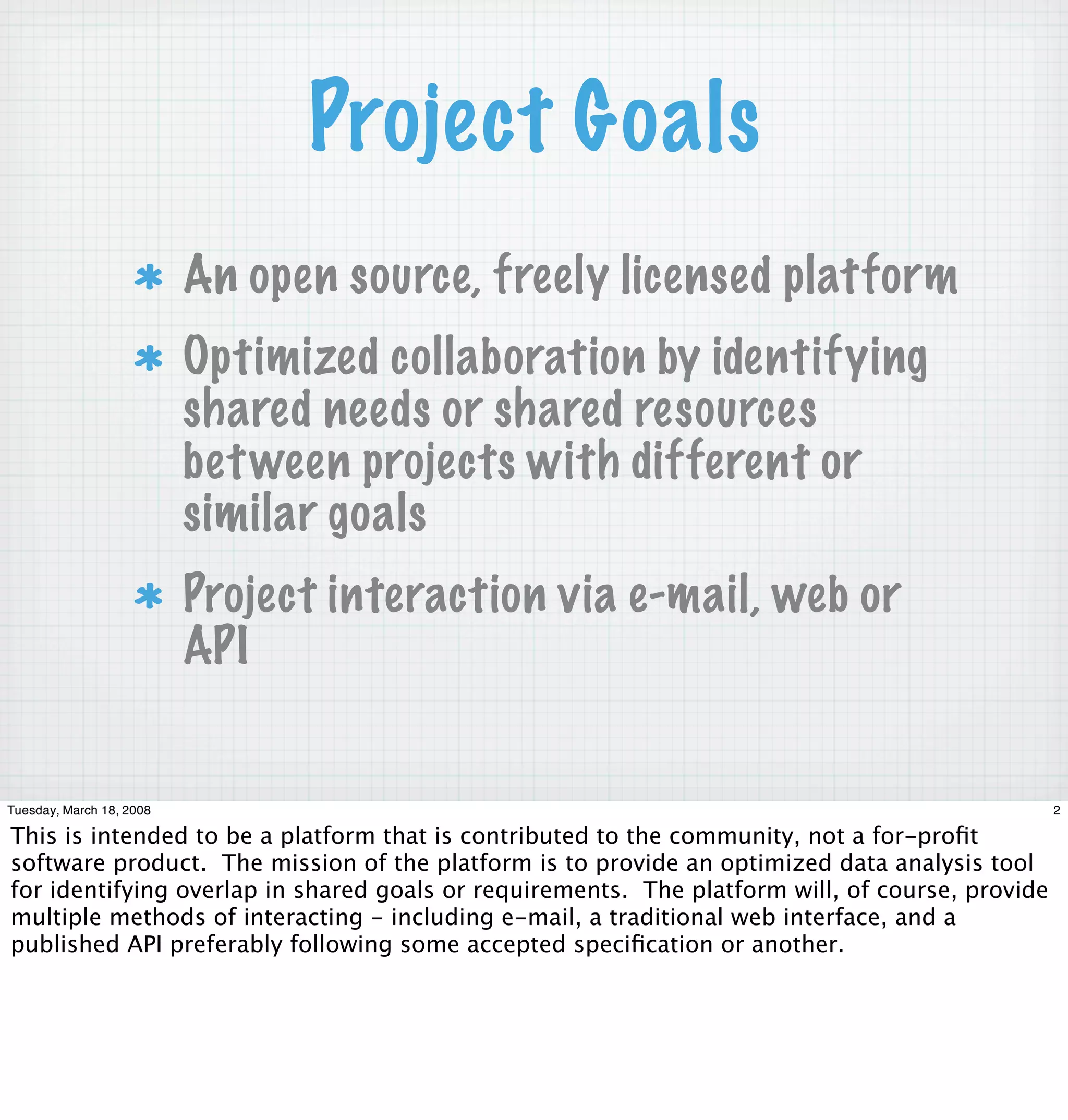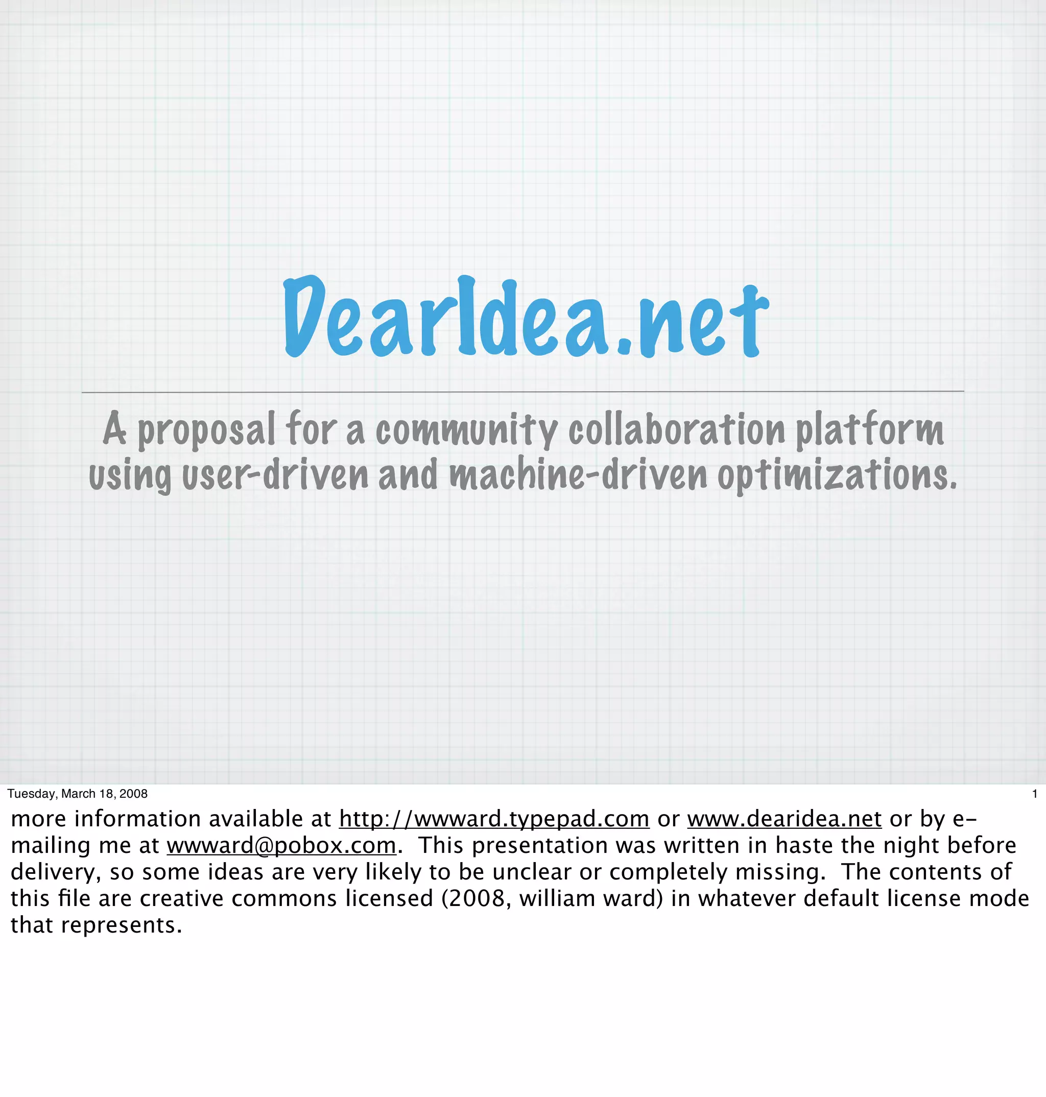 This document proposes DearIdea.net, an open source collaboration platform that uses natural language processing and user tags to identify shared needs or resources between community projects. The platform would allow projects to be submitted with tags and analyzed to determine similarities through weighted scoring of user and machine-applied tags. Challenges include inexperience, determining feasibility, and maintaining interest, but presenting the idea at BarCampNYC could help address feasibility while using existing tools could reduce programming requirements. Currently, the domain exists without content and the author seeks advice and criticism to further develop the idea.