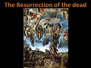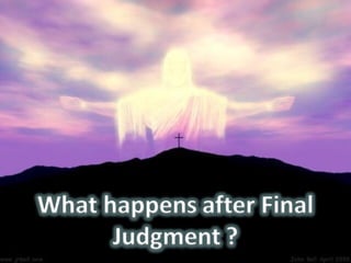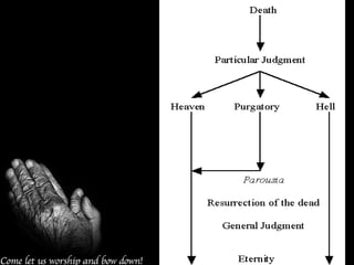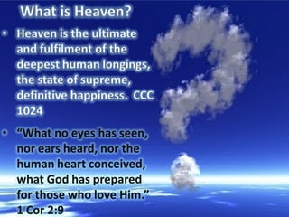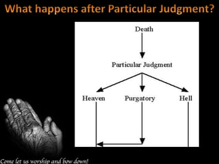The document discusses Catholic teachings on death, judgment, heaven, hell, and eternal life. It provides biblical support for the beliefs that: