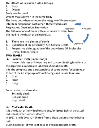 1. Death is defined as the complete and irreversible stoppage of respiration, circulation, and brain functions. It is a continuous process rather than a single event. 2. There are two phases of death - somatic death, which is the irreversible loss of integrated functioning of the organism, and molecular death, which is the death of individual organs and tissues. 3. Immediate changes that occur after death include insensibility, loss of reflexes, cessation of respiration and circulation, and a flat EEG rhythm. Early changes include eye changes, skin changes, muscular flaccidity, algor mortis, and postmortem lividity.