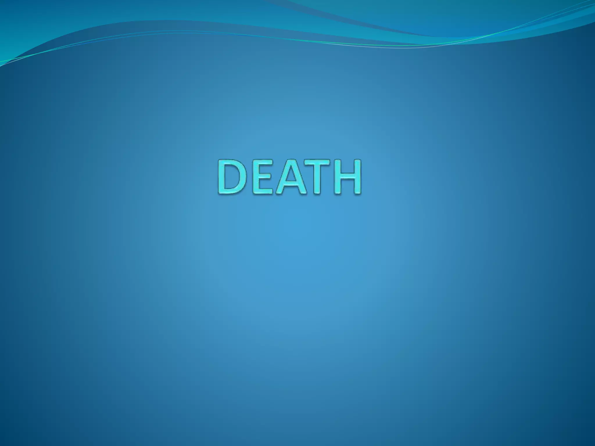 This document discusses death and different types of death. It defines death as the permanent loss of vital functions and introduces the new concept of brain death. It describes three types of death: somatic, molecular, and brain death. Somatic death is the irreversible stoppage of circulation, respiration, and brain functions. Molecular death is death at the cellular level, which can continue for hours after circulation stops. Brain death can be cortical, brain stem, or whole brain. Brain stem death is the loss of vital centers controlling respiration and consciousness. Criteria for determining brain death include the Philadelphia protocol, Minnesota criteria, and Harvard criteria, which evaluate responsiveness, breathing, movements, reflexes, and EEG results.