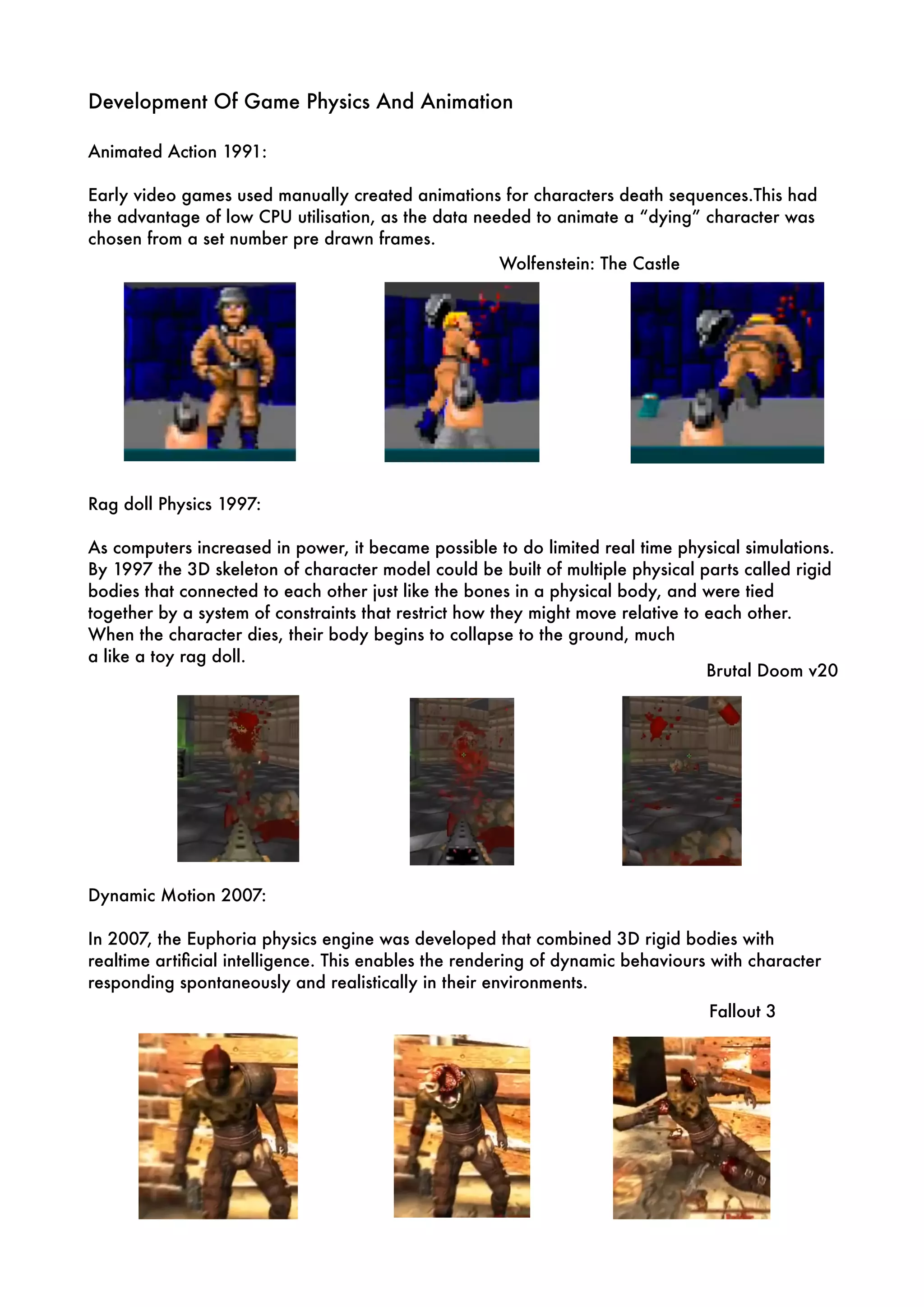 Early games used pre-drawn animations for character deaths, which had low CPU usage. In 1997, games began using rag doll physics to simulate character bodies collapsing realistically when dying, with multiple connected rigid bodies and constraints. By 2007, physics engines combined rigid bodies with artificial intelligence, allowing dynamic behaviors and spontaneous, realistic character responses to environments.