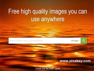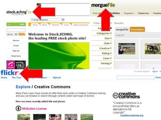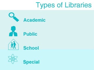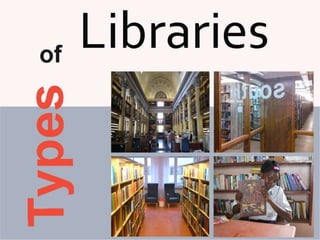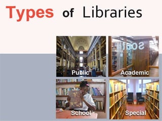 There are four major types of libraries described in the document: academic libraries which serve colleges and universities, public libraries which serve cities and towns, school libraries which serve students from kindergarten to grade 12, and special libraries which are located in specialized environments like hospitals, corporations, and museums. The document contains numerous photographs with attribution to various photographers and sources.