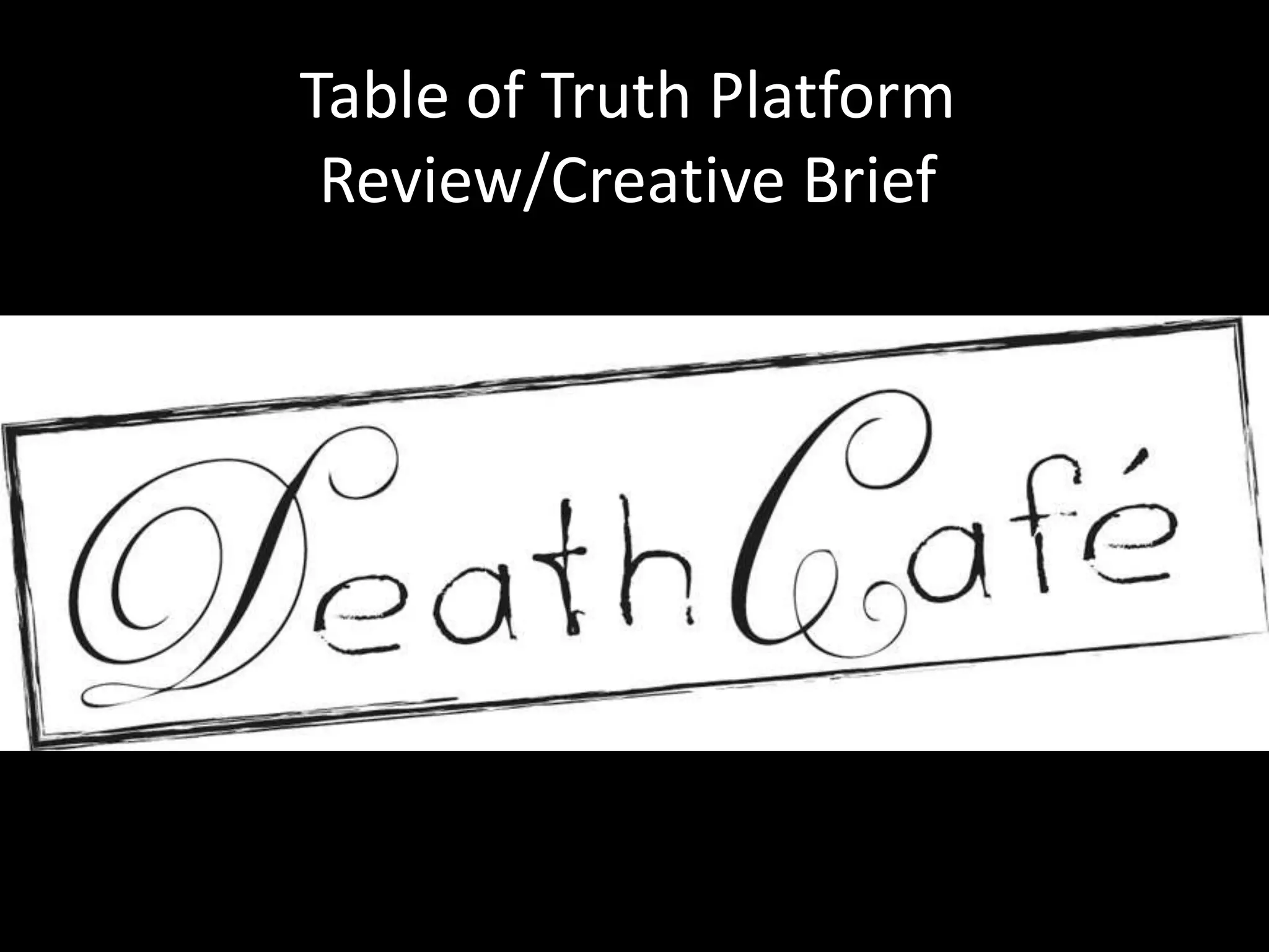 The document discusses Death Cafe, a grassroots movement that holds discussions about death to help people make the most of their lives, outlines their basic website and social media presence, and identifies opportunities to make the platform more interactive, extend their reach through social media, and potentially partner with similar organizations.