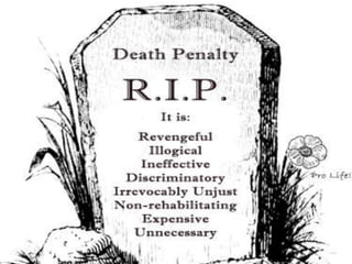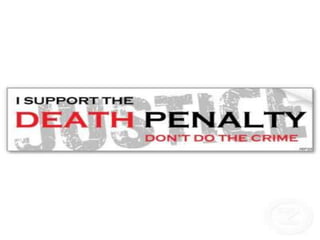 The document discusses the history of the death penalty from ancient civilizations to its introduction and use in Britain and America. It notes that the earliest death penalty laws date back to 18th century BC in other civilizations. During the reign of King Henry VIII in Britain, an estimated 72,000 people were executed. The abolitionist movement began with the writings of European theorists like Montesquieu and Cesare Beccaria's influential essay "On Crimes and Punishments". The document also lists some perceived advantages and disadvantages of the death penalty.